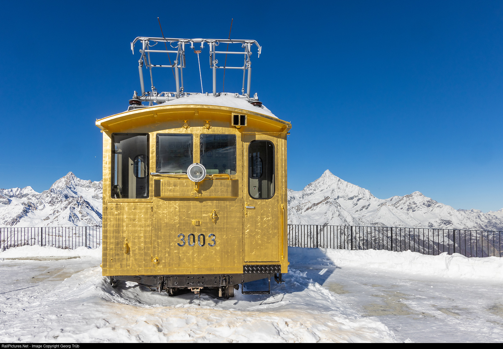 "Golden Spot" on 3089 meter a.s.l. on the Gornergrat, between 4073 meter high Obergabelhorn on the left and 4505 meter high Weisshorn on the right. The electric cogwheel locmotive He 2/2 # 3003 is exhibited on this place since august 20, 2023, to celebrate 125 years Gornergratbahn. The 132 kW locomotive was delivered in 1898 by SLM and BBC as # 3 for the 9,34 kilometer long 1 meter gauge mountain railway, and decomissioned on april 3 of this year only, but not used anymore since deacades. Now gold plated with 23 3/4 carat redgold by two people working one month to became the "Golden Spot" photo point.