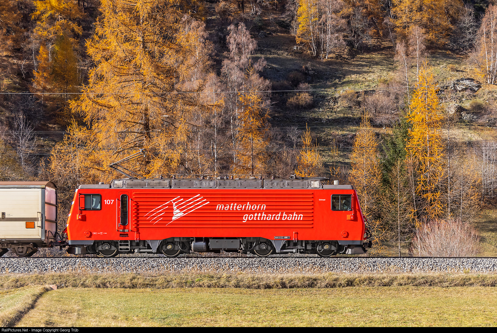 | Cogwheel locomotive HGe 4/4 II # 107 of the Matterhorn-Gotthard-Bahn (MGB), after a large refit in the SBB works of Bellinzona, pulls the freight train 4244 from Zermatt to Visp, south of Täsch. |