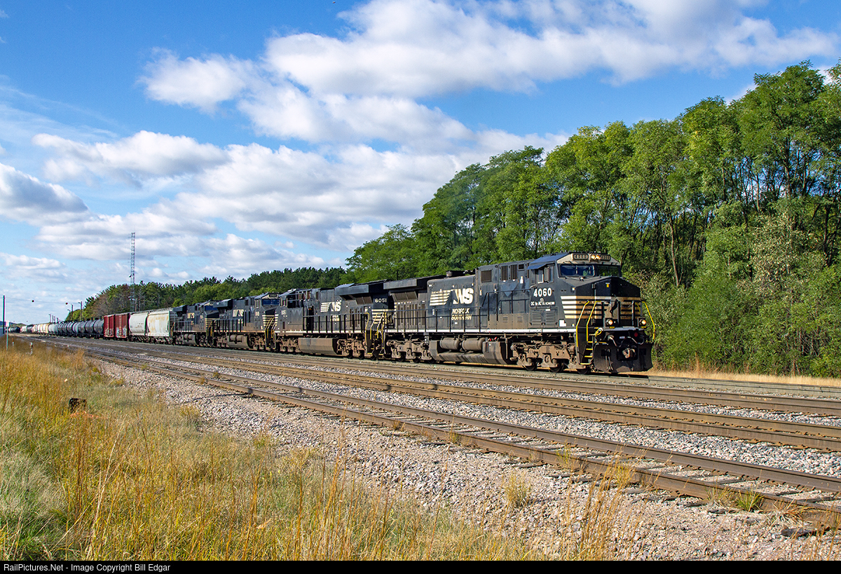 | NS 4060 leads a quartet of NS power on the Union Pacific at Altoona, WI. The crew is doubling over some tracks to complete assembly of their Altoona to Adams, WI bound train. Once assembled and air tested, the train would be on its way east. NS 4060 is a rebuilt C40-9W converted from DC to AC. |
