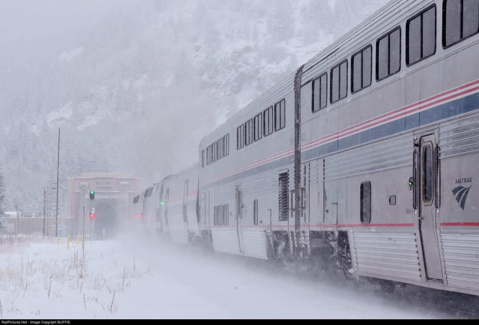Heavy snow and freezing fog greet the California Zephyr as it gets ready to enter the east portal of the Moffat Tunnel at Tolland, Colorado.