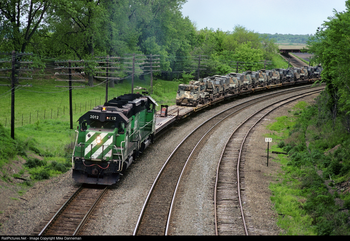 Burlington Northern EMD GP40 No. 3012 leads an eastbound BN military extra through Buda, Illinois, on the railroad’s Galesburg to Aurora main line on May 21, 1989.