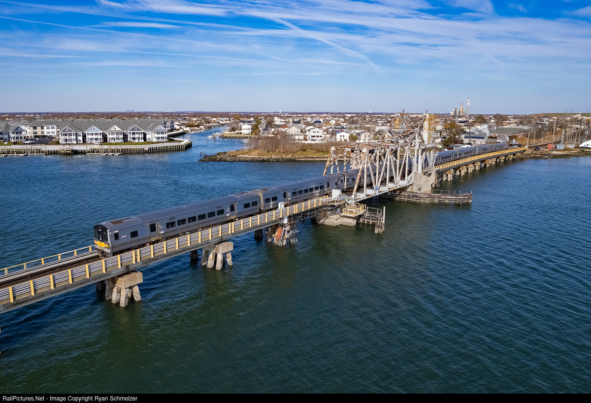 A train of M7s from Penn Station cross Wreck Lead after a station stop in Island Park. It will reach its terminus of Long Beach immediately after crossing the bridge.