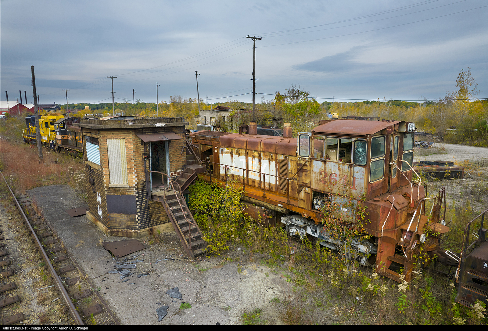 Now at Larry's Truck the SP 2641 was Brand New and shiny in 1972. The now rusty and picked over SW 1500 sports LTEX reporting markings and the paint is nearly gone but the Southern Pacific Lineage is still distinguishable. The 2641 sits in a short string of locomotives by an old scale house building at Larry's McDonald Ohio location. October is the perfect time of year for locomotive grave yard photography.