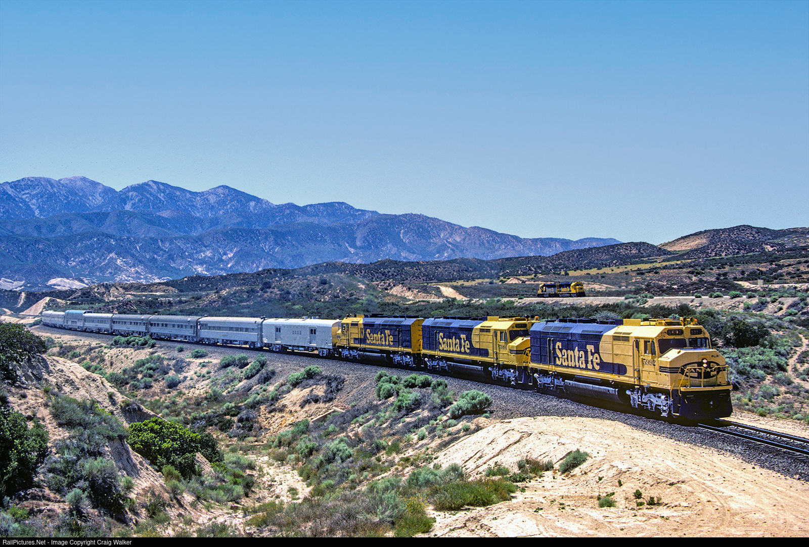Atchison Topeka & Santa Fe FP45 5992 (ex-5942, nee-102), teamed with FP45s 5991 and 5998, is on the point of a 14-car Analysts' Special climbing Cajon Pass as the train heads from San Diego to Bakersfield. The train is climbing the original mainline, Track 1, normally used for downhill movements (due to a slightly steeper grade). Meanwhile, in the distance on Track 2, as two diesel helper set (an SD45 and a GP35) can be seen drifting downgrade back to San Bernardino after assisting an eastbound freight up to Summit. (Cajon Pass, California - May 3, 1984)