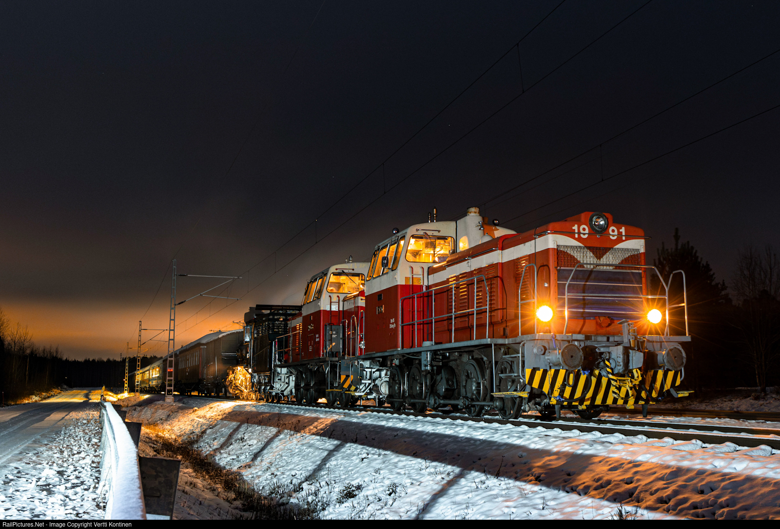 | Haapamäki Museum Locomotive society, or HMVY for short is once again on a tour with their Tk3 1136 steamer. This weekend Tk3 is giving rides at Rauma and Pori with a mix of 1950s and 1970s coaches. However as the distance between Haapamäki and Rauma is way too long for the Tk3, the longer empty stock moves are done with Dv15 1991 and Dv16 2038. Here the train V 12920 is seen at Suoniemi siding to meet four incoming passenger and freight trains |