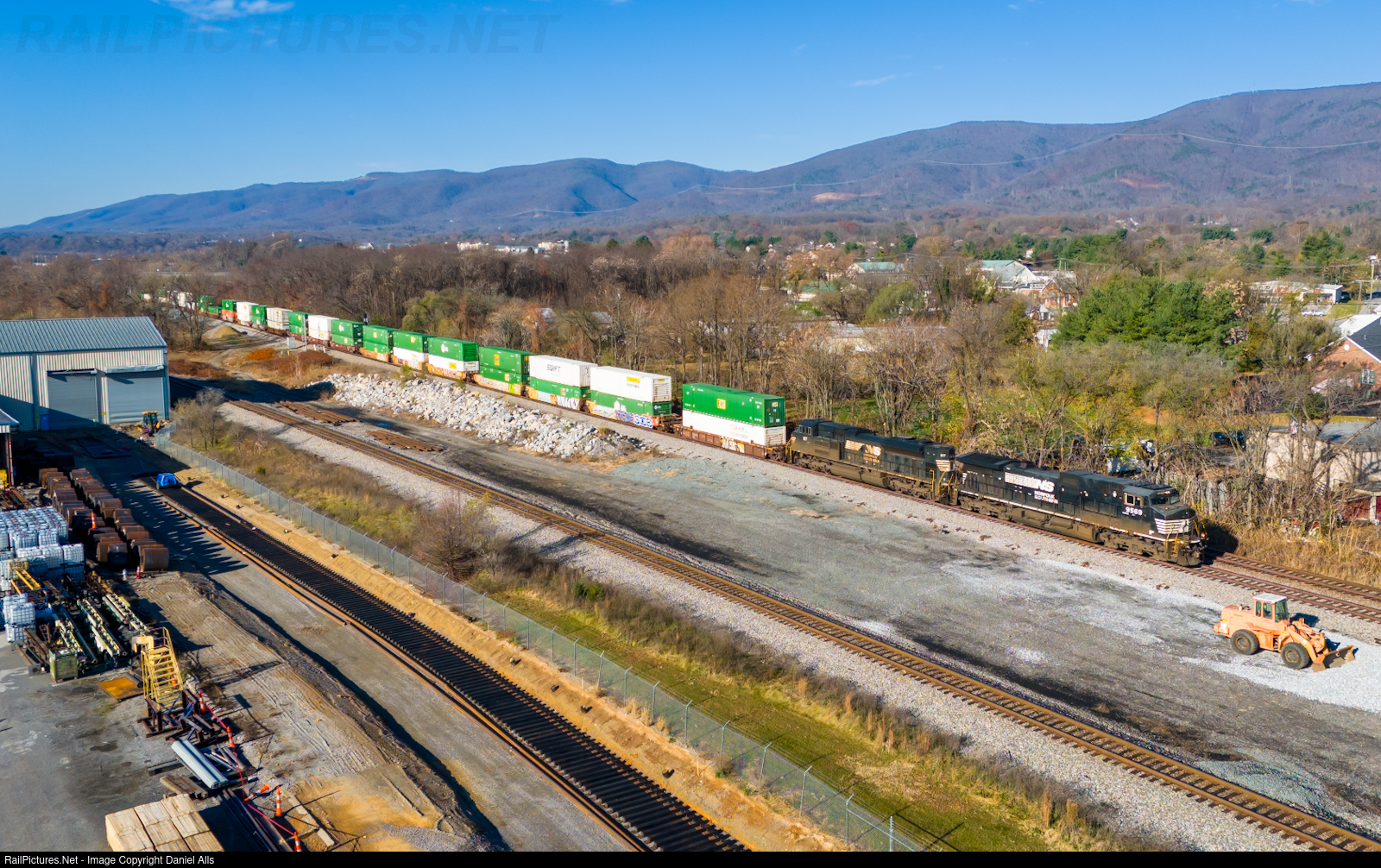 | Passing by the New Millennium Building Materials supplier is intermodal NS 288. An old logo dash 9 is in charge as it heads east through Glenvar, VA and by the paralleling Whitethorne district. |
