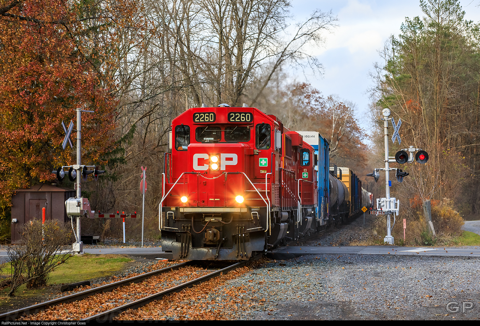 | Stirring up the leaves & dust; CP 2260 & 2252 in-charge of Z323 (G41) get underway after stopping at Beaver Dam Road as they rumble over the Maple Ave. grade crossing in Selkirk before before they pull the train around the curve into CSX Selkirk Yard |