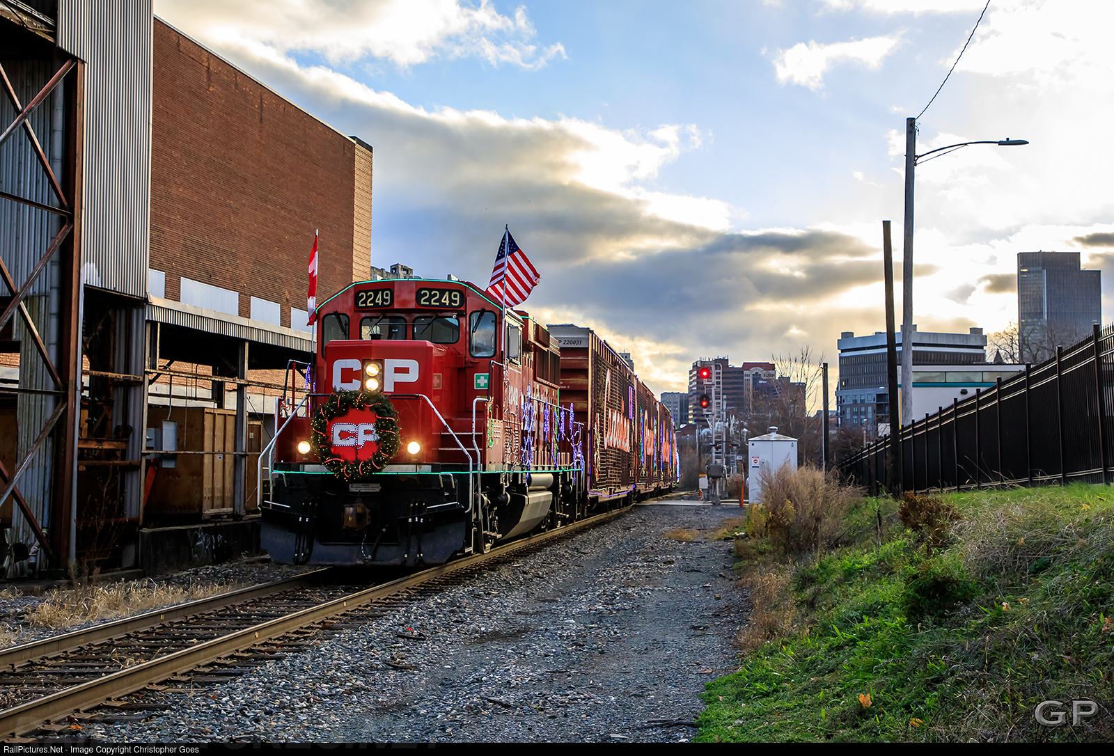 CP 2249 leading the CPKC Holiday Train rolls by the U-Haul storage building as it climbs out of Albany at N. Ferry St. northbound for Menands.