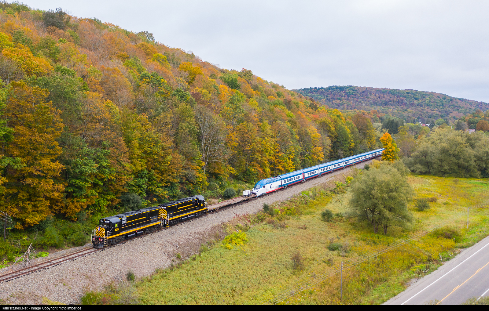 | A pair of WNYP Alco's are pulling a special move of an Amtrak Avelia trainset from Alstom's Hornell Plant bound for storage in Olean as they roll past some early fall colors in Alfred, New York. The train has completed its climb up the grade to Tip Top Summit and is now following the valley of Railroad Brook towards Andover. |