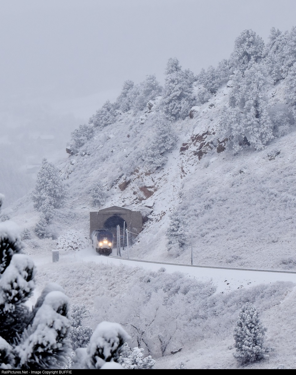 The California Zephyr emerges from Tunnel #1 at Plainview, Colorado after a strong winter storm and freezing fog has frosted the landscape.
