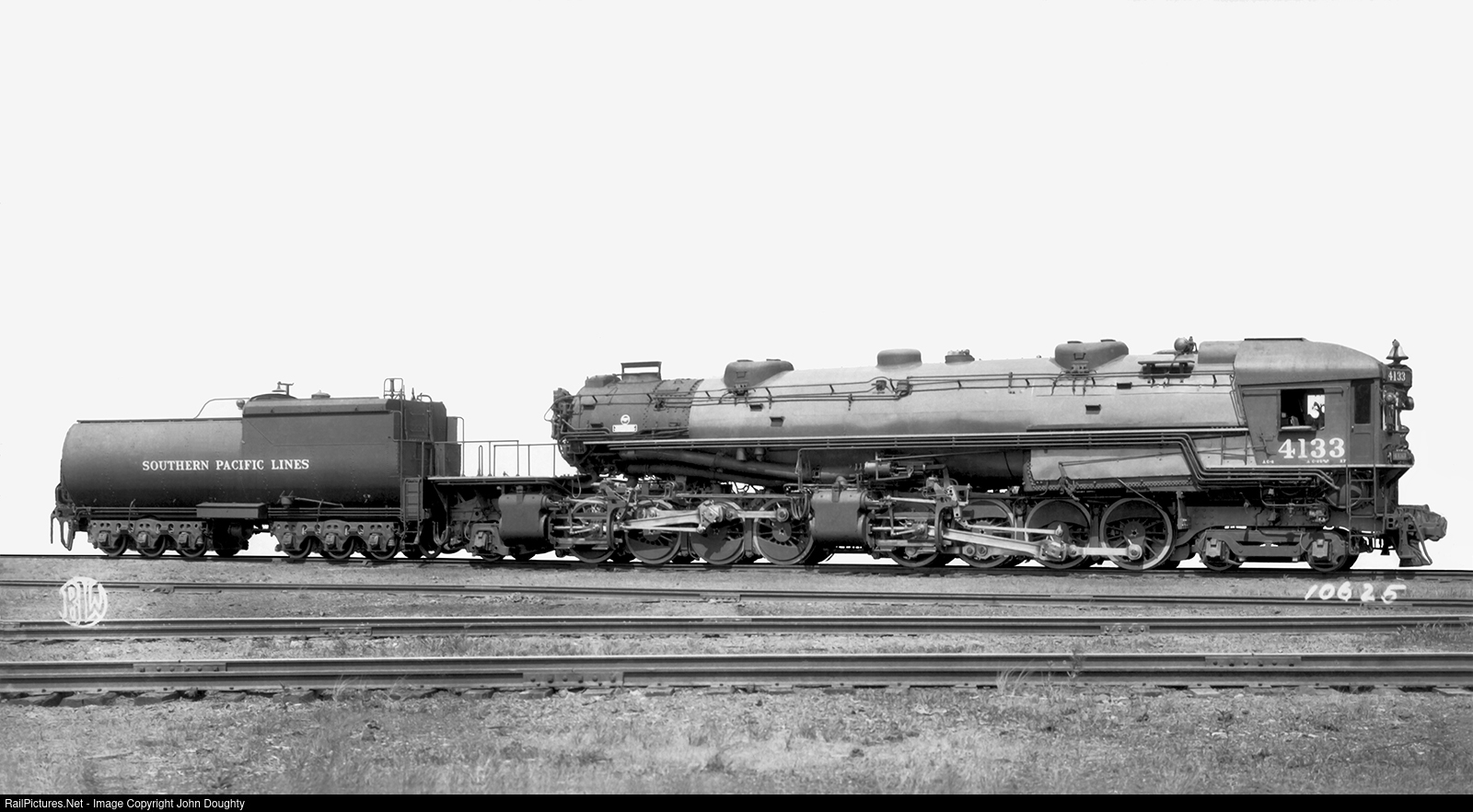 My great, great uncle Robert F. McKee, Sr., was a design engineer at Baldwin and he would give my father different Baldwin Locomotive Works builder's cards when my father would visit him in Collingswood, New Jersey. This is the 4-8-8-2 cab forward, number 4133, was built for the Southern Pacific Railroad. I am a big fan of articulated steam locomotives, and I am glad this was part of my father's collection. According to the specifications listed on the back of the builder's card this engine and tender had a total weight of 935,500 lbs., and it had a tractive force of 123,400 lbs. This Baldwin Locomotive Works builders photo card is from the John R. Doughty collection.