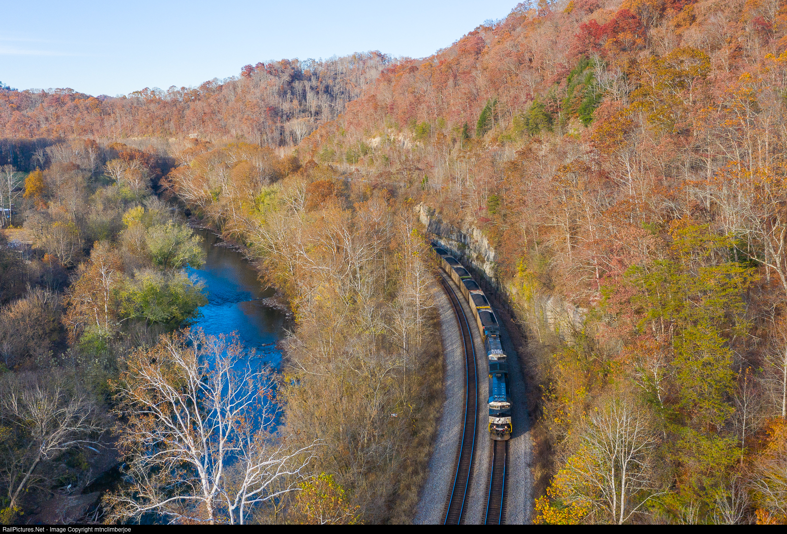 | With late fall colors clinging to the trees, a pair of Norfolk Southern GE's catch slivers of evening sun as they lead coal loads south on the Kenova District, pulling through a rock cut along the bank of the Tug Fork River. The train is approaching Webb, West Virginia and will pause briefly to meet a northbound intermodal train as the line is single tracked for a section between Webb and Crum. |