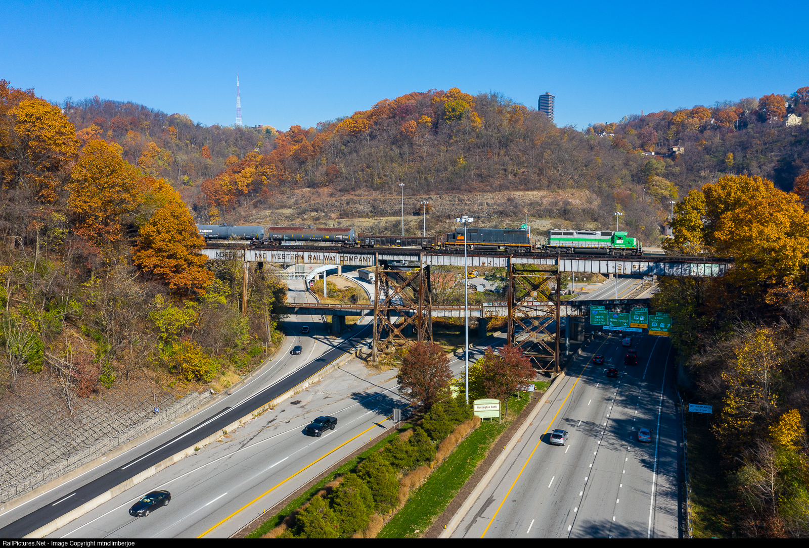A former FURX SD40-2 leads another SD40-3 on the Wheeling & Lake Erie 618 as it crosses over I-376 on the south side of Pittsburgh, Pennsylvania as a few late fall leaves still cling to the trees. The train is bound for Connellsville to interchange with CSX.