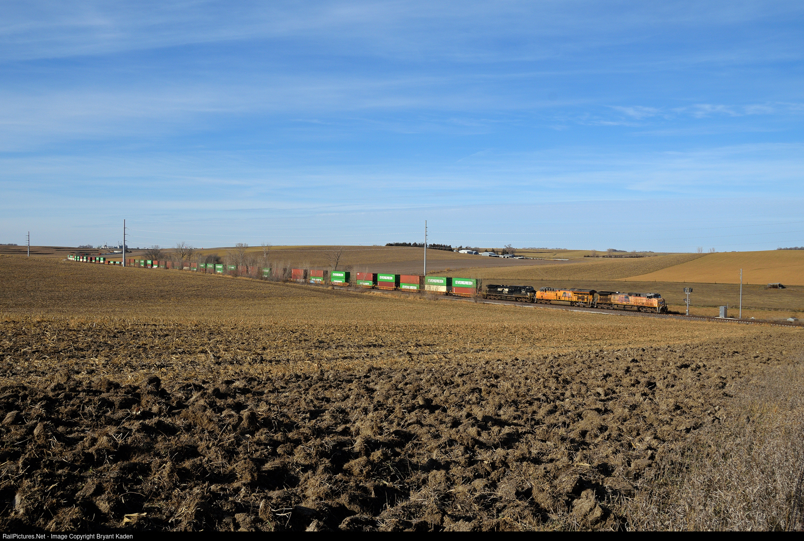 | A lengthy eastbound Union Pacific train with a mix of intermodal and manifest traffic and UP and NS power descends the east side of Arlington Hill as it makes its way toward the Missouri River crossing and Iowa state line at Blair on Thanksgiving Day 2023. |