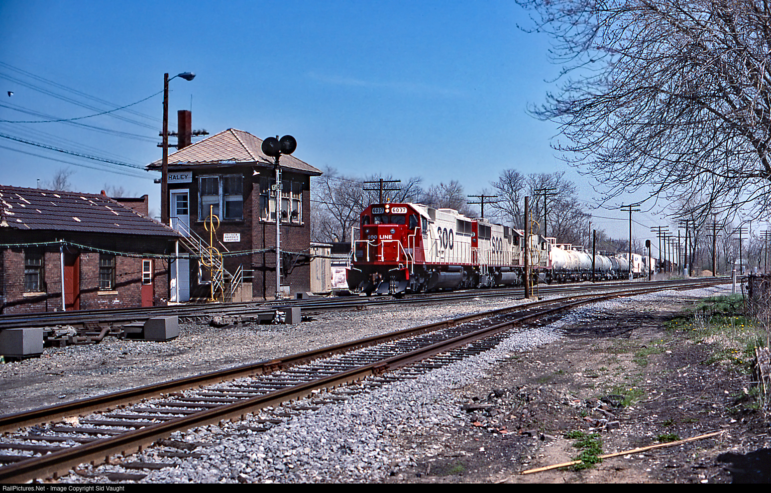Good old ramshackle Haley, how we miss it, with its railfan guest book, friendly operator and three busy railroads. Here a southbound freight, probably the daily Louisville train, is rattling past. Photo by Mike Dolenski. From my collection.