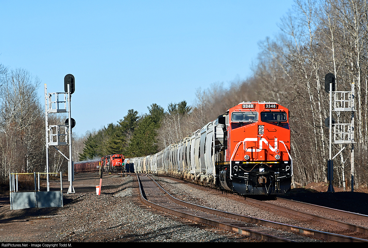 | Coming and going. Pushing a sand train up the CN Missabe sub is a very new CN 3348 while a very old DMIR 404 waits in the siding with the crew giving the roll-by. Ironically or coincidently, these new/rebuilt AC44C6Ms will be the replacement power for the Dash 8s that are being retired which replaced most of the SD40-3s at both Two Harbors and Proctor, MN in the CN ore pool. |