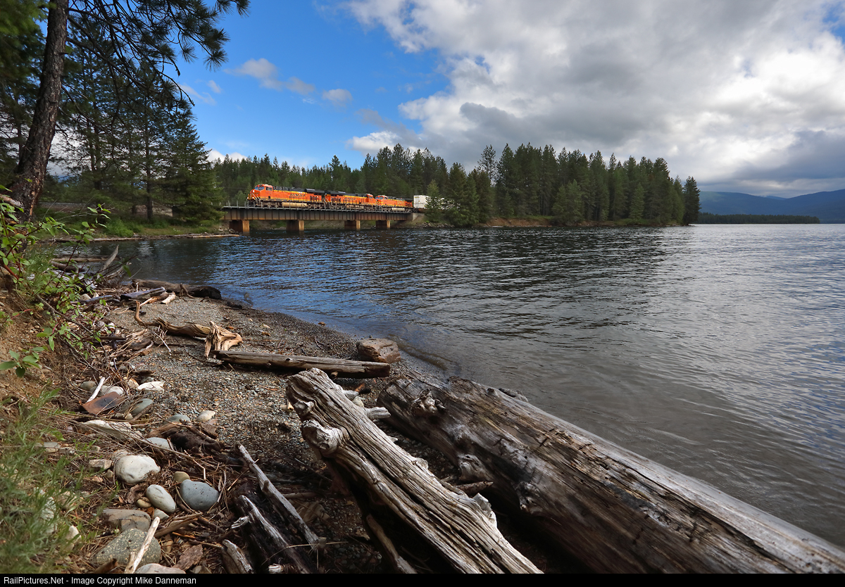 A westbound BNSF Q train flies across Bridge 62 at Tuscor, Montana on July 4, 2022. This bridge spans the inlet for Swamp Creek into the Clark Fork on Montana Rail Link’s Fourth Subdivision.