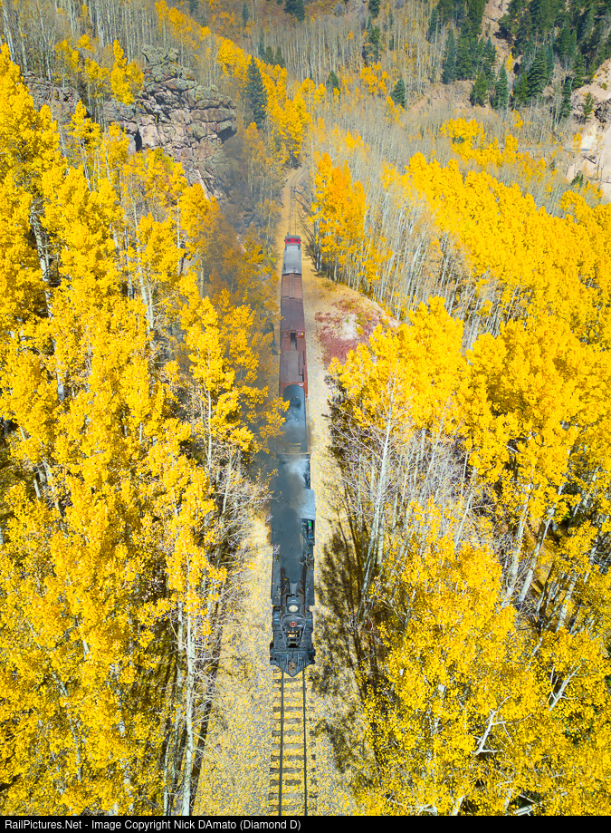 Narrow gauge straightaway through a tunnel of aspen at the peak of their fall color