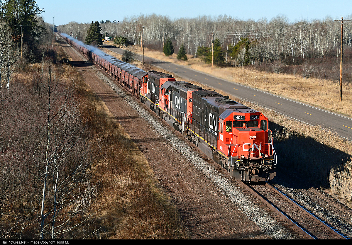 | About 15,000 tons of taconite pellets spaced out in 138 ore cars pulled by three SD40-3s cruise down the CN Missabe Sub near Saginaw as they roll towards Proctor yard. |