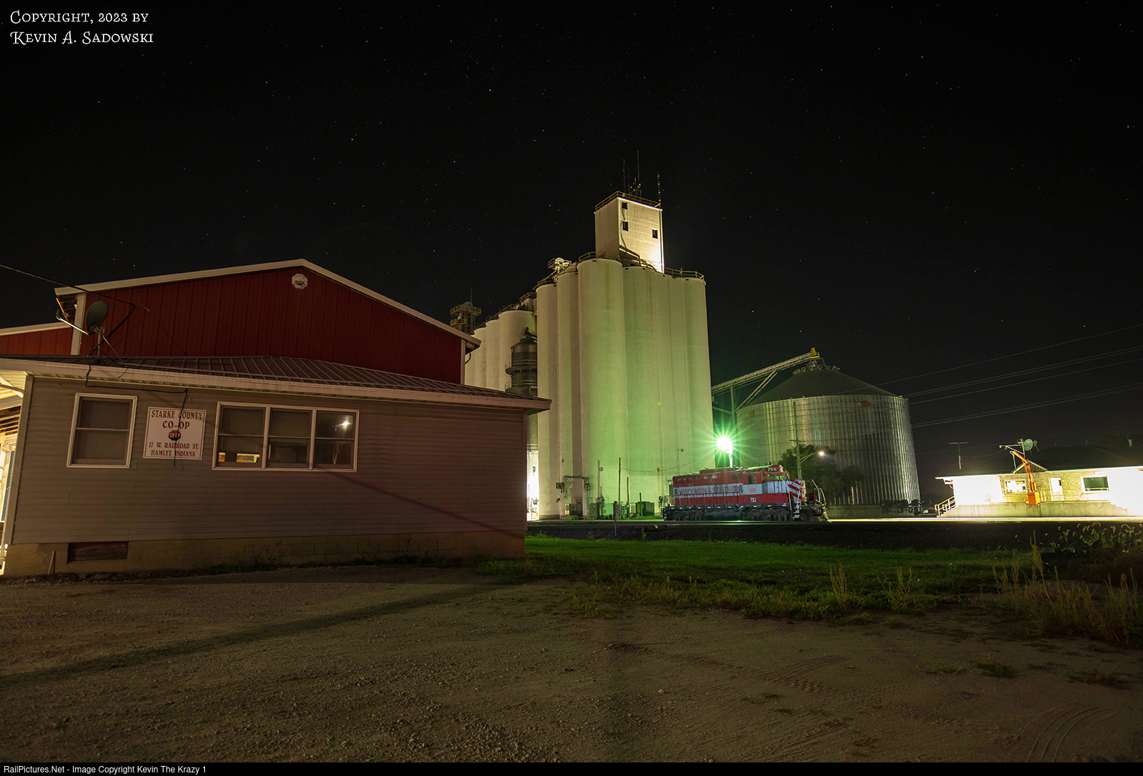 Former WSOR GP9R #753 under the stars at Starke County Co-Op in Hamlet, IN.