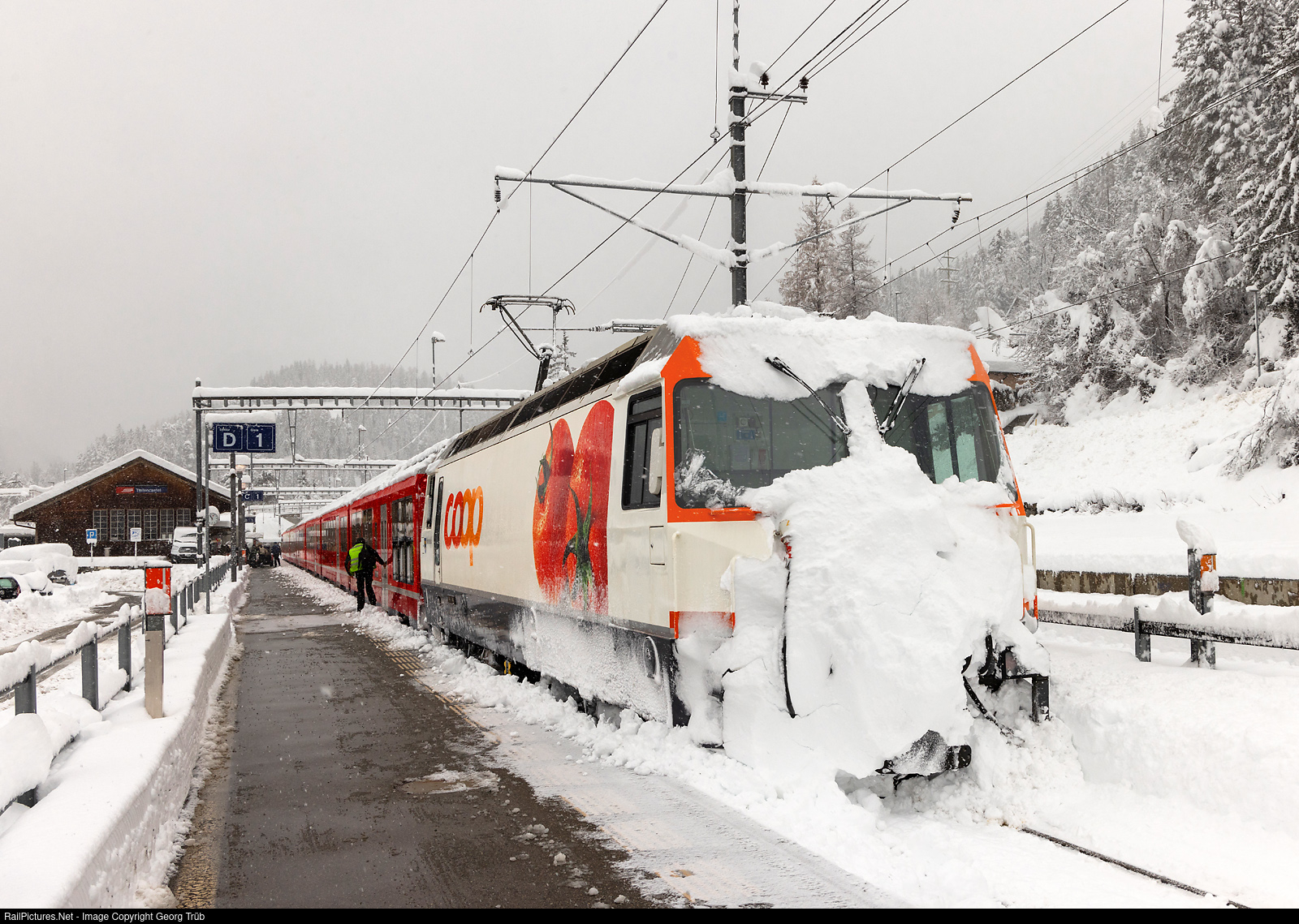 Interregio 1125 of the Rhaetian Railway from Chur to St.Moritz after the arrival in Tiefencastel, with locomotive Ge 4/4 III # 641 in Coop publicity paint scheme. The train returned to Chur afterwards, because the line towards Filisur was blocked by IR 1121. On this day, several lines of the RhB were closed down due to heavy snowfall (trees on the track etc.), for example Chur-Arosa, Davos-Filisur, Tiefencastel-Bergün, S-chanf-Zernez.