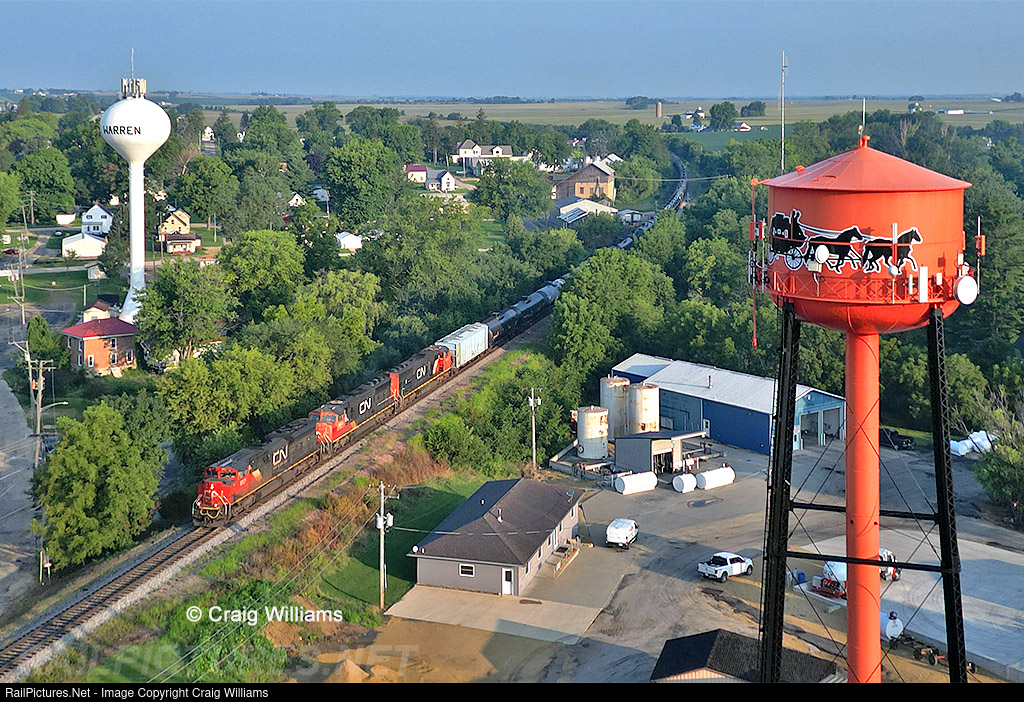 The town of Warren shows off its heritage of the Stagecoach Trail on its water tower. The Trail is a historic route through northwest Illinois that connected Lena with Galena. The trail was a part of the larger Galena–Chicago trail that crossed almost the entire state. Warren is a town along that route that was founded in 1843. Nowadays, the CN Dubuque/Freeport Subs parallel a lot of the trail. Here, we have a Levis, PQ, bound ethanol train, making good time as they work towards Chicago. The train is bound for eastern Canada from Tara, IA.
