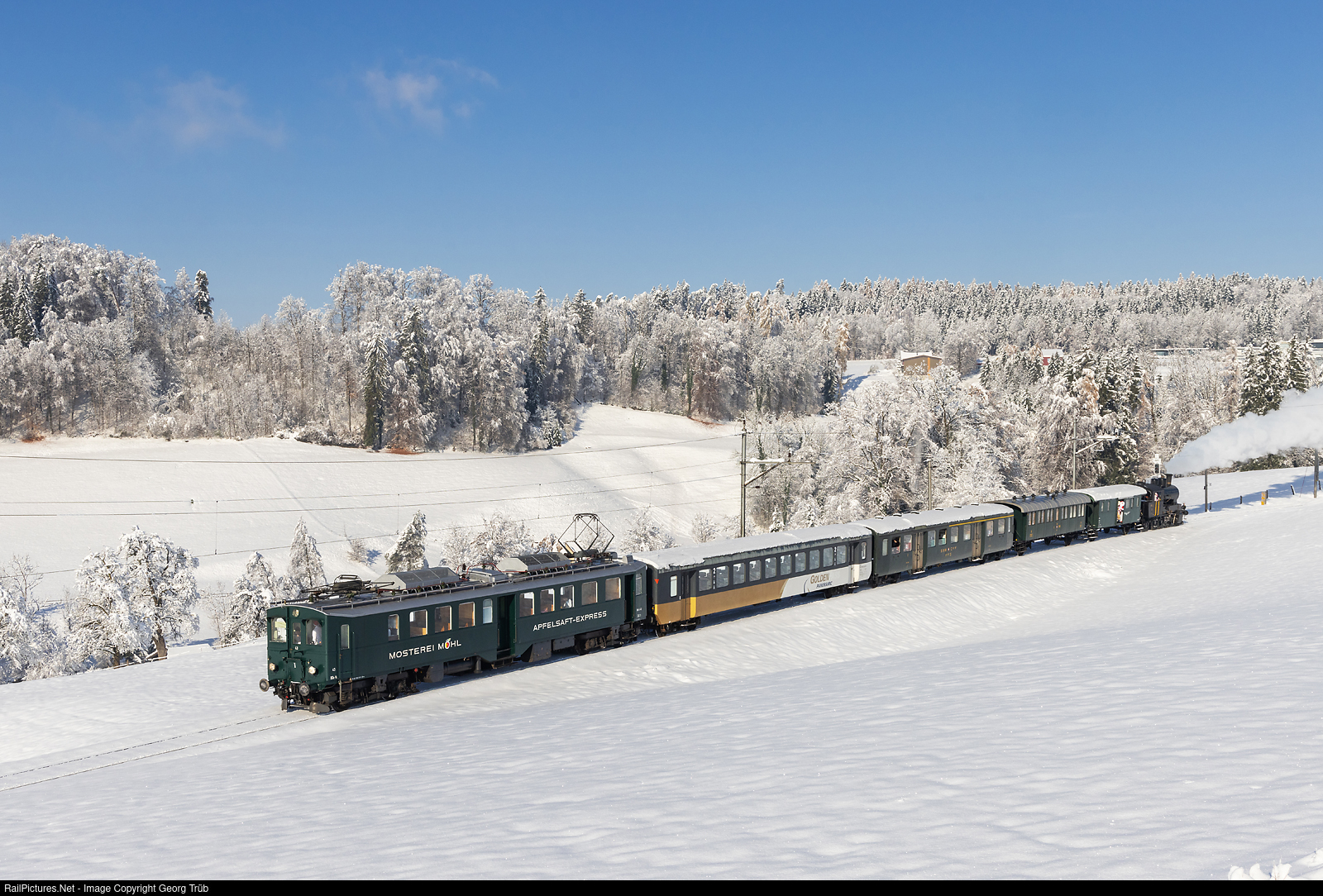 | Passenger railcar BDe 3/4 # 43 "Mosterei Möhl Apfelsaft-Express" of the Eurovapor pulls the Santaclaus Express 31716 from Hauptwil to Bischofszell Nord, on the occasion of the advent mart Bischofszell. In the rear is steamlocomotive Ec 3/5 # 3 of the association Historic Mittel-Thurgau-Bahn. |