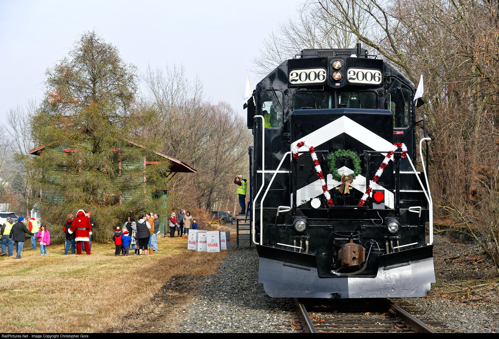 The Toys for Tots train has just arrived at the Port Murray stop in front of the Port Murray station.