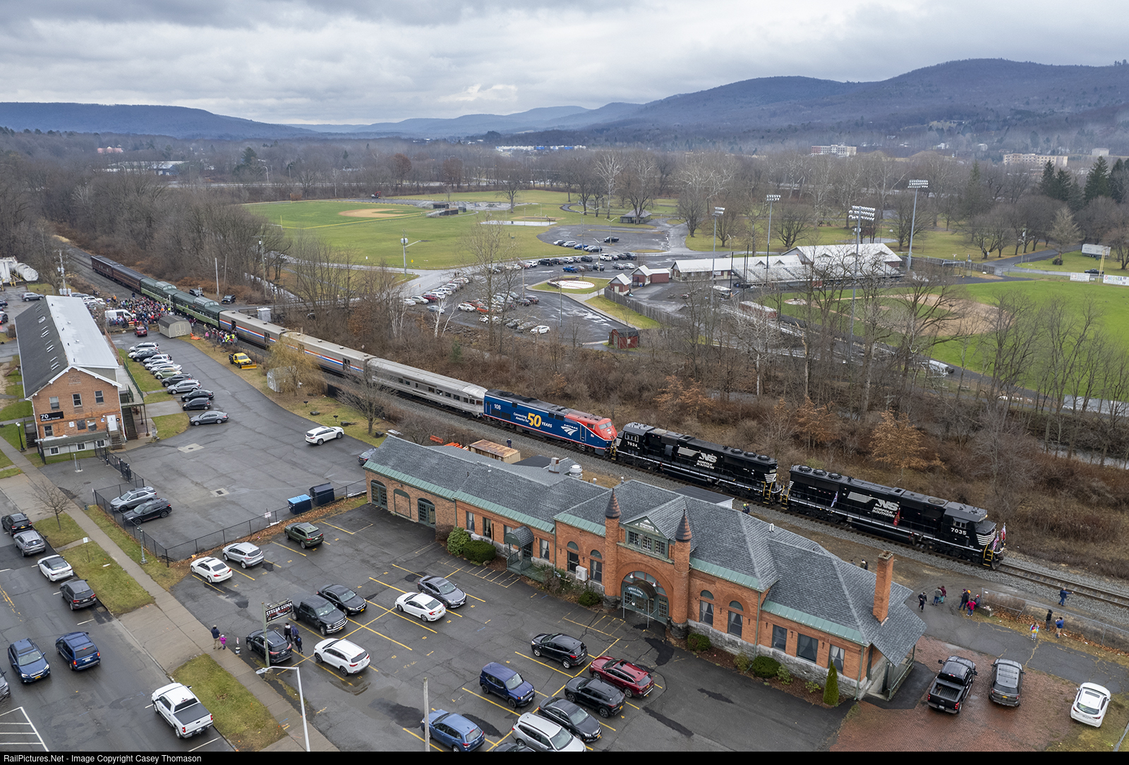 The 2023 Norfolk Southern + Amtrak "Capital Region" Toys For Tots train is stopped in front of the Delaware and Hudson depot in Oneonta, New York, during its southward run from Albany to Binghamton, distributing toys, food, clothing, and seasons' greetings for those in need along the route.