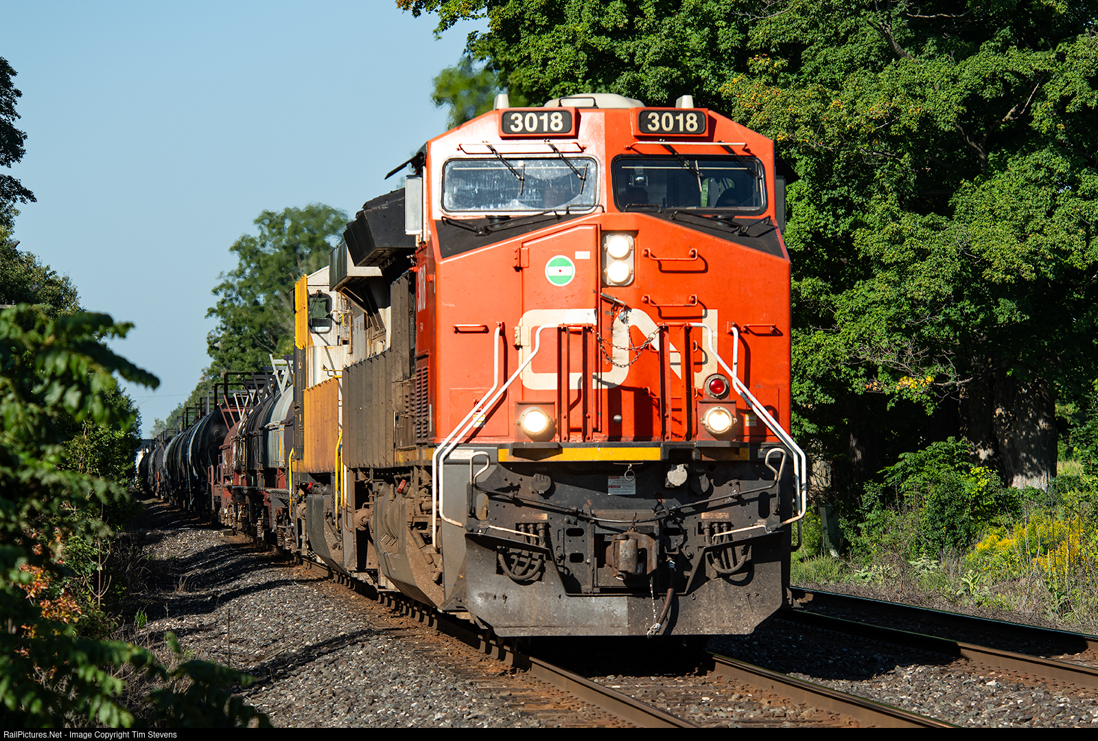 CN ET44AC 3018 leads a short 43 car train L502 east from Sarnia to Garnet.