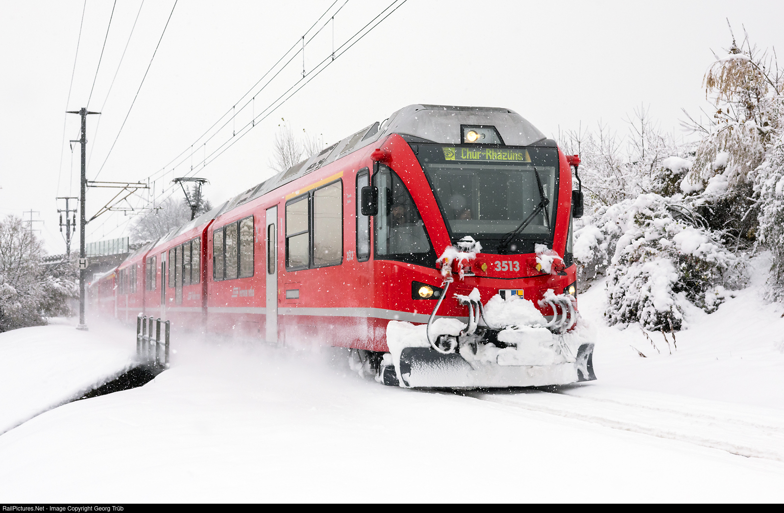 On Saturday, December 2, operations on the entire RhB network were severely affected by the heavy snowfall. Several lines such as Tiefencastel-Bergün, Chur-Arosa, Davos-Filisur and between Zernez and S-chanf were closed for many hours or even the whole day, mainly due to fallen trees. There were many long delays and train cancellations, and some rail replacement services could not be set up due to closed roads. This is a replacement train on the S1 line from Schiers to Rhäzüns with a push-pull train which is usually running on the Chur-Arosa line, between Zizers and Untervaz. "Allegra" ABe 8/12 # 3513 is pulling a standard car type AB II, a second class standard car type B I built in 1969 in the "Bärenland" design (since 2019), and the cab car BDt # 1756.