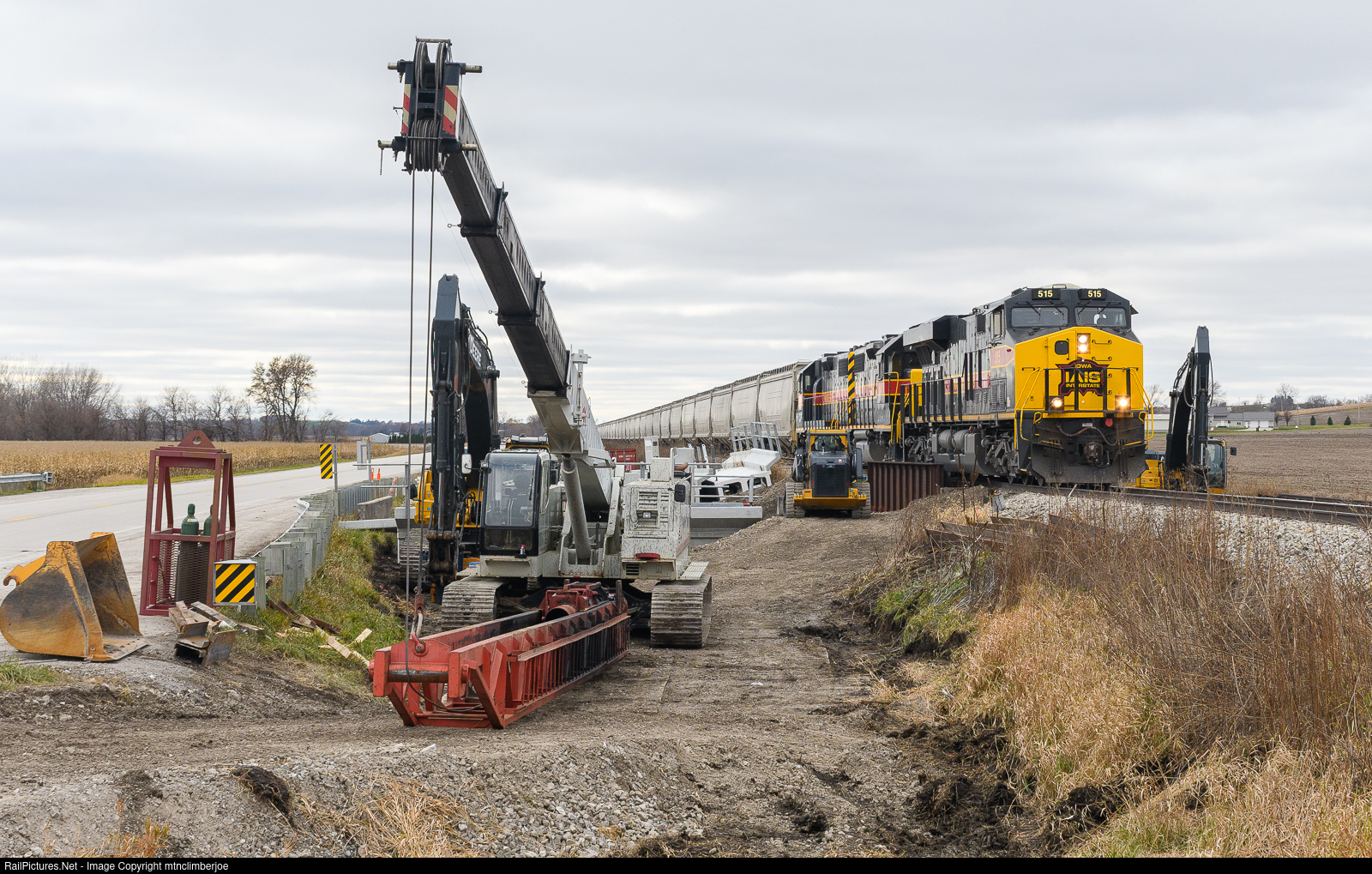 | With a GEVO and two GP's on the head end and another GEVO bringing up the rear, the Iowa Interstate's CBBI has slowed to pass through a work zone along Route 6 outside of Ladora, Iowa. Crews are making preparations to replace the girder bridge that spans an unnamed tributary of Big Bear Creek. |