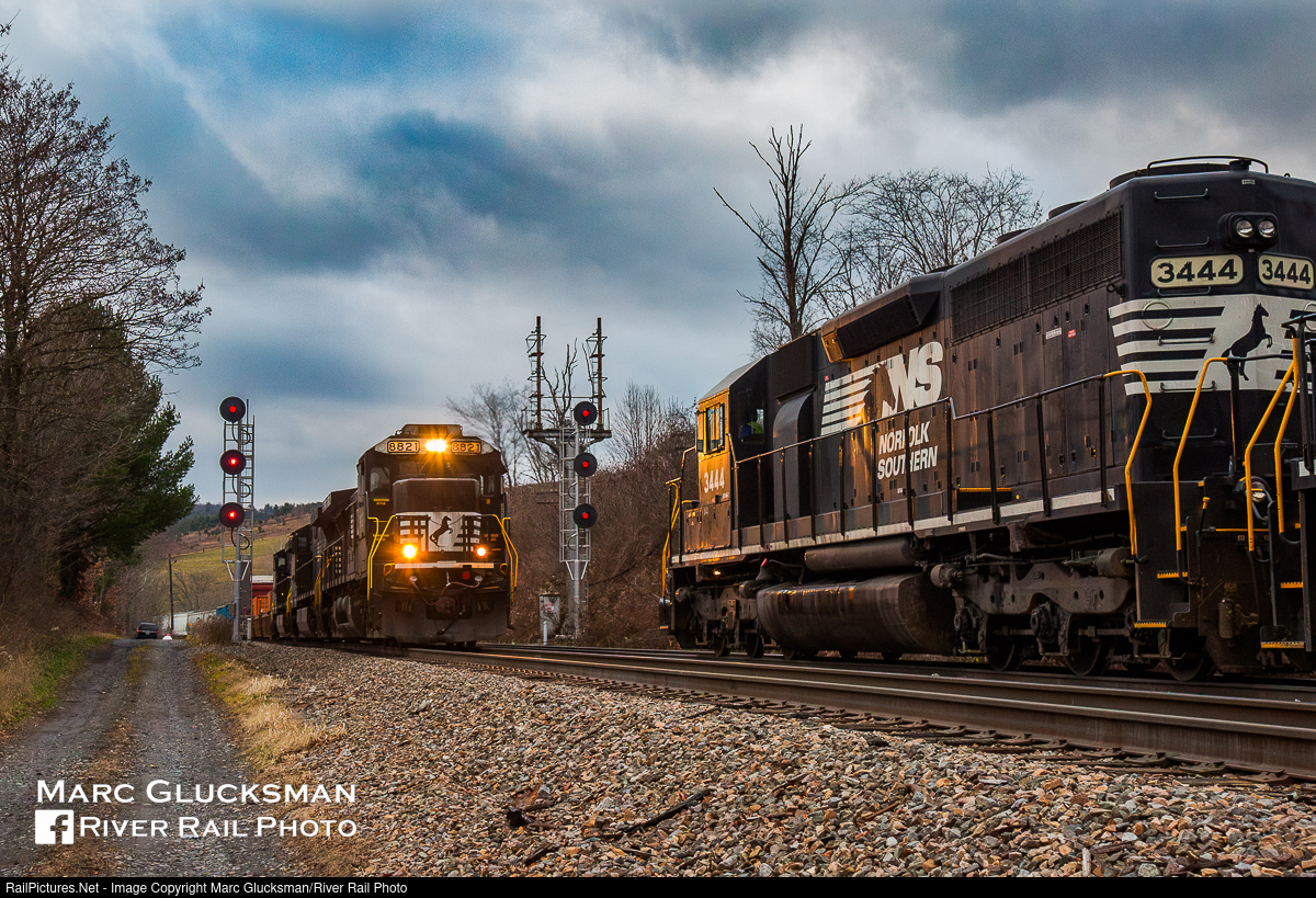 Top Hat At The Pitchfork. Norfolk Southern had only owned this portion of the Delaware & Hudson for a few months when this not be recreated meet occurred on the evening of December 4, 2015 at CPF 590 Afton, New York. NS 8821 (C40-9/D9-40C, 3/1995) would become NS 4063 (AC44C6M), but was in an accident and scrapped. EMD SD40-2 NS 3444 was originally Pennsylvania Railroad SD40 6056 (2/1966), and would become Penn Central 6056 and Conrail 6309, but also could not escape rebuilding and has become NS SD33ECO 6219.