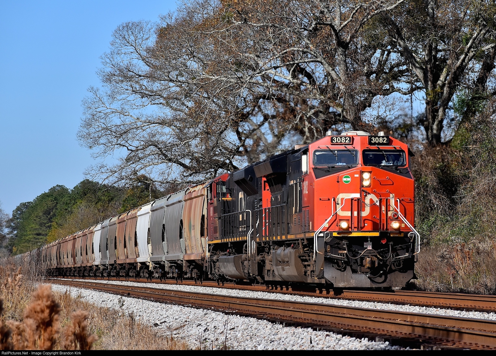 | Adding a splash of red to the Lineville Subdivision, is CSX train B241. Loaded with tons of potash (149 cars), two engines lead the Tampa bound train south with a double also assisting on the rear. As seen here, Canadian power is usually assigned to this train. NOTE: The number boards are slightly different. |