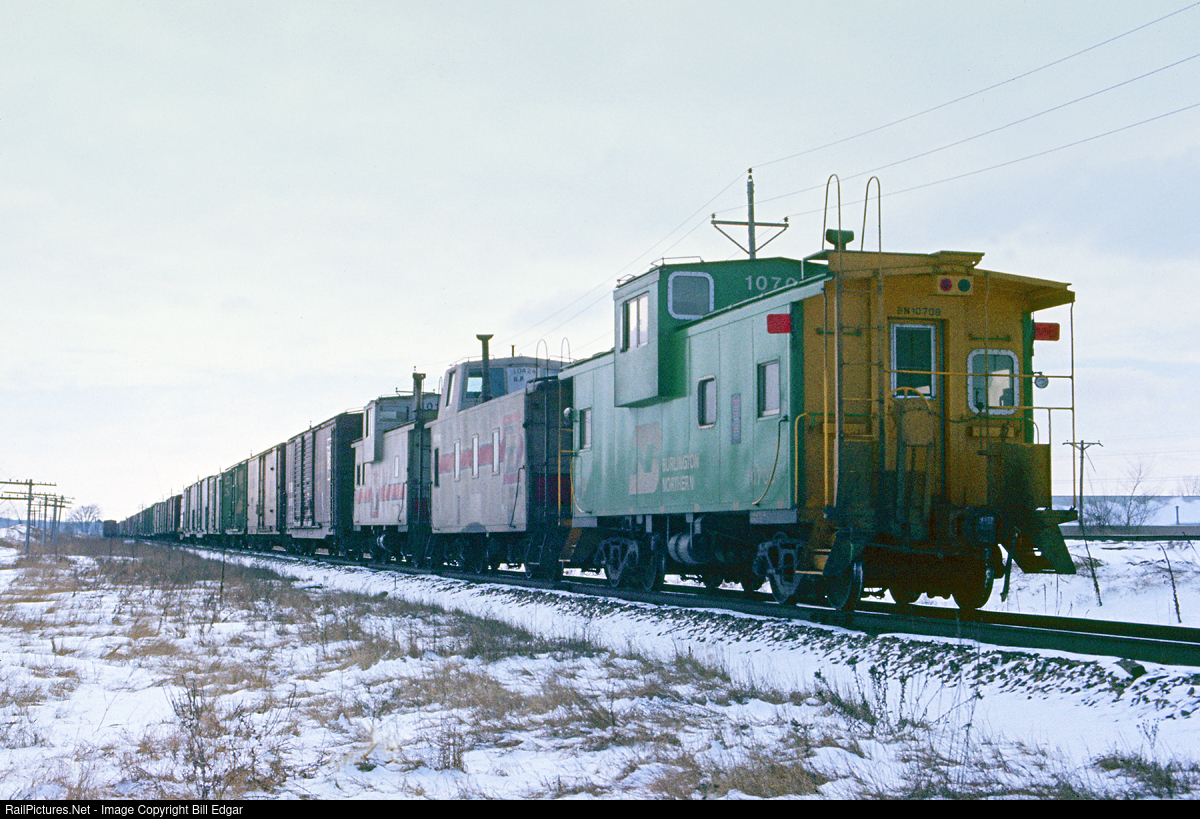 A trio of cabooses bring up the rear of a westbound BN freight rolling through Newport, MN on its last lap into the Twin Cities. BN 10708, a modern extended vision caboose is preceded by two former Burlington ones. The middle caboose was a slightly sloped cupola style built in Burlington's Havelock shops at Lincoln, NE. The first ones classified as NE-12 were built in 1954, the NE-12A version in 1960. After that, CBQ switched to extended vision cabooses like the lead one on this train.