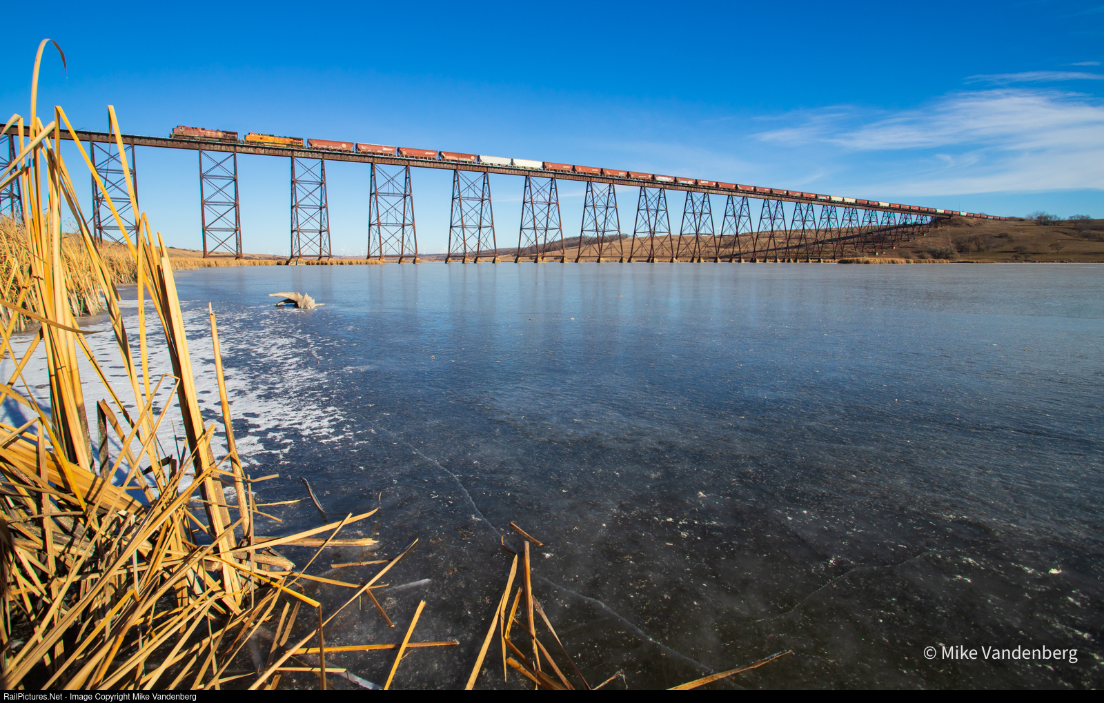 Grain loads that were handed off from the Red River Valley & Western RR at Casselton soar west near Luverne on a perfect December Sunday.