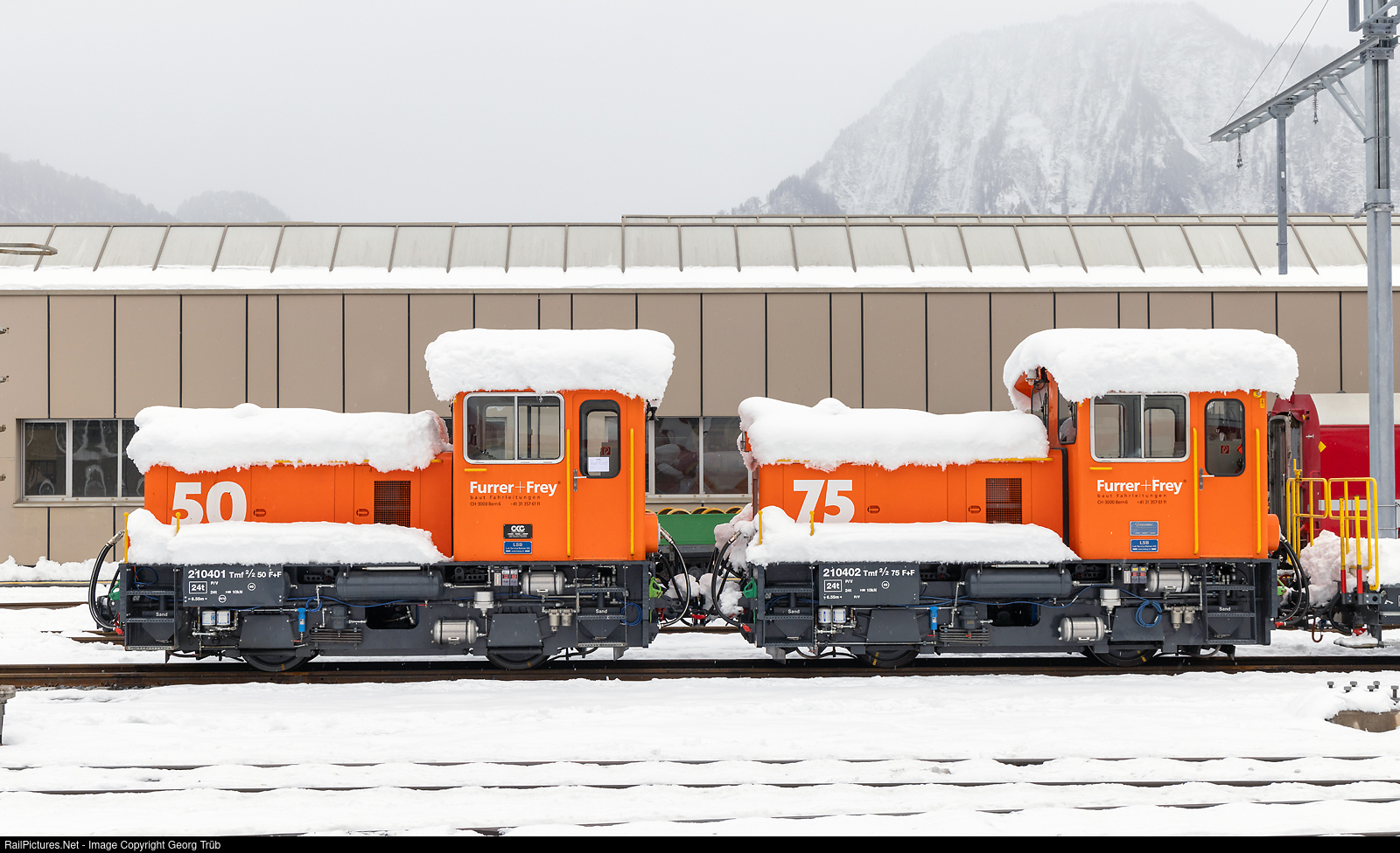 | Diesel shunters Tmf 2/2 # 50 and # 75 of the Furrer & Frey company, stabled in Landquart. This vehicles are used for the renewal of the overhead wire system in Landquart, mainly by night. This vehicles with 40 km/h maximum velocity were built by Gmeinder (Kaelble-Gmeinder Gmbh, Mosbach/Germany) and reconstructed by LSB (Lok Service Balmer) in 2019. |