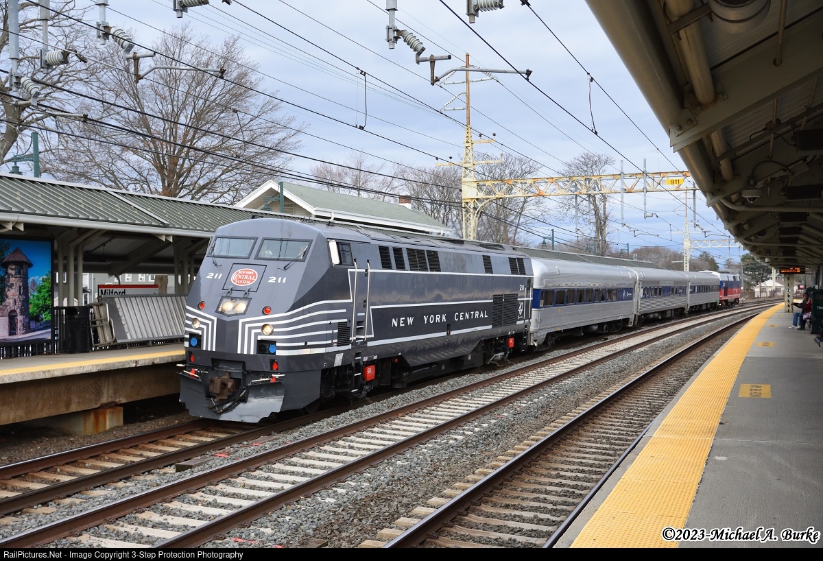 Metro-North's 2023 holiday train passes Milford Station, en route to its next stop at Mott Haven Yard in the Bronx. Bracketing Metro-North’s business cars are two P32 locomotives, which are wrapped in celebrating the 40th Anniversary of Metro-North Railroad. Leading the train is New York Central 211 and bringing up the rear is 208 wearing the beach ball scheme. This train runs on certain days in December, making stops at all the major shop locations including Grand Central Terminal, handing out gifts to its employees.