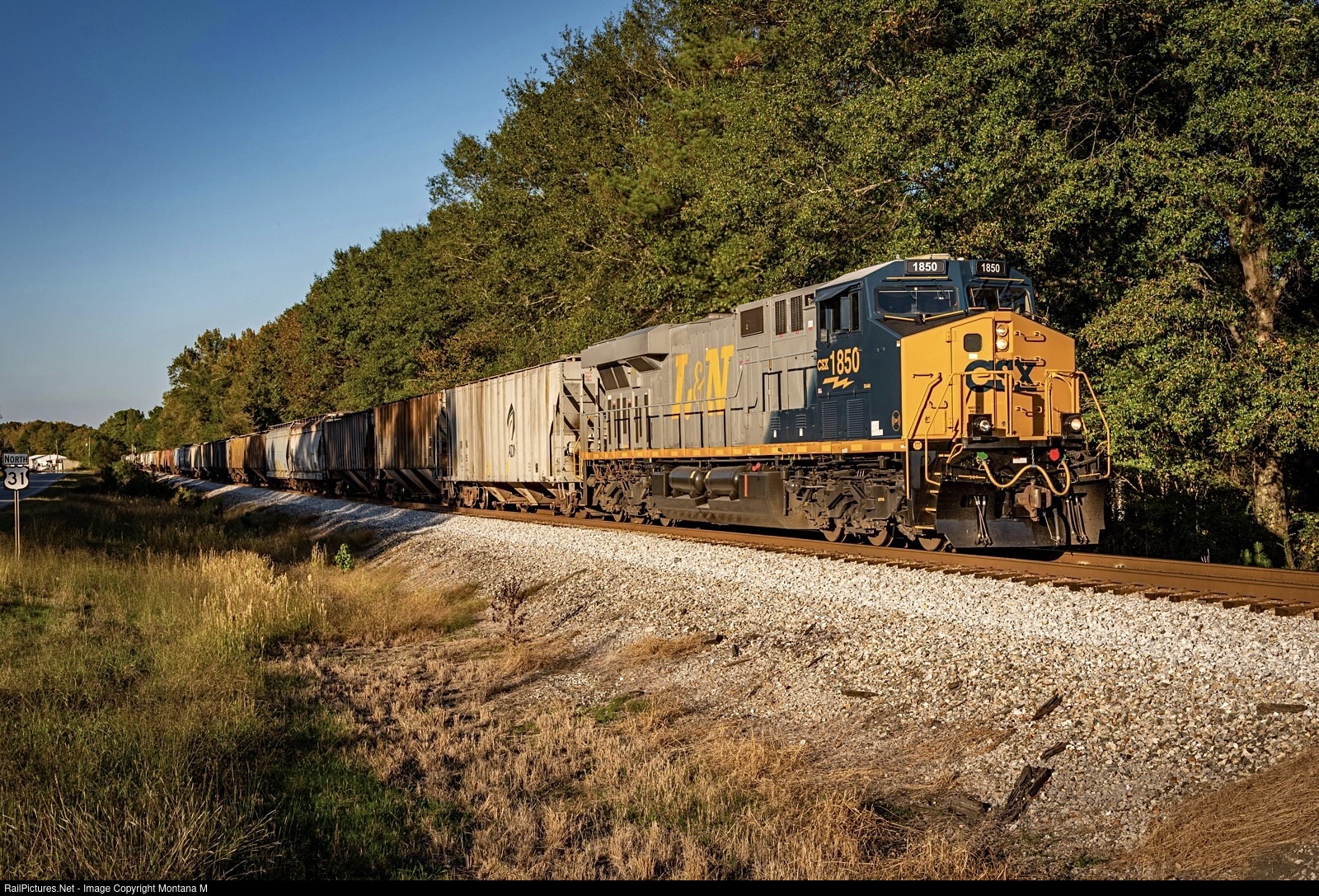 CSXT 1850 leading 90 loaded grain cars south for Mobile,AL