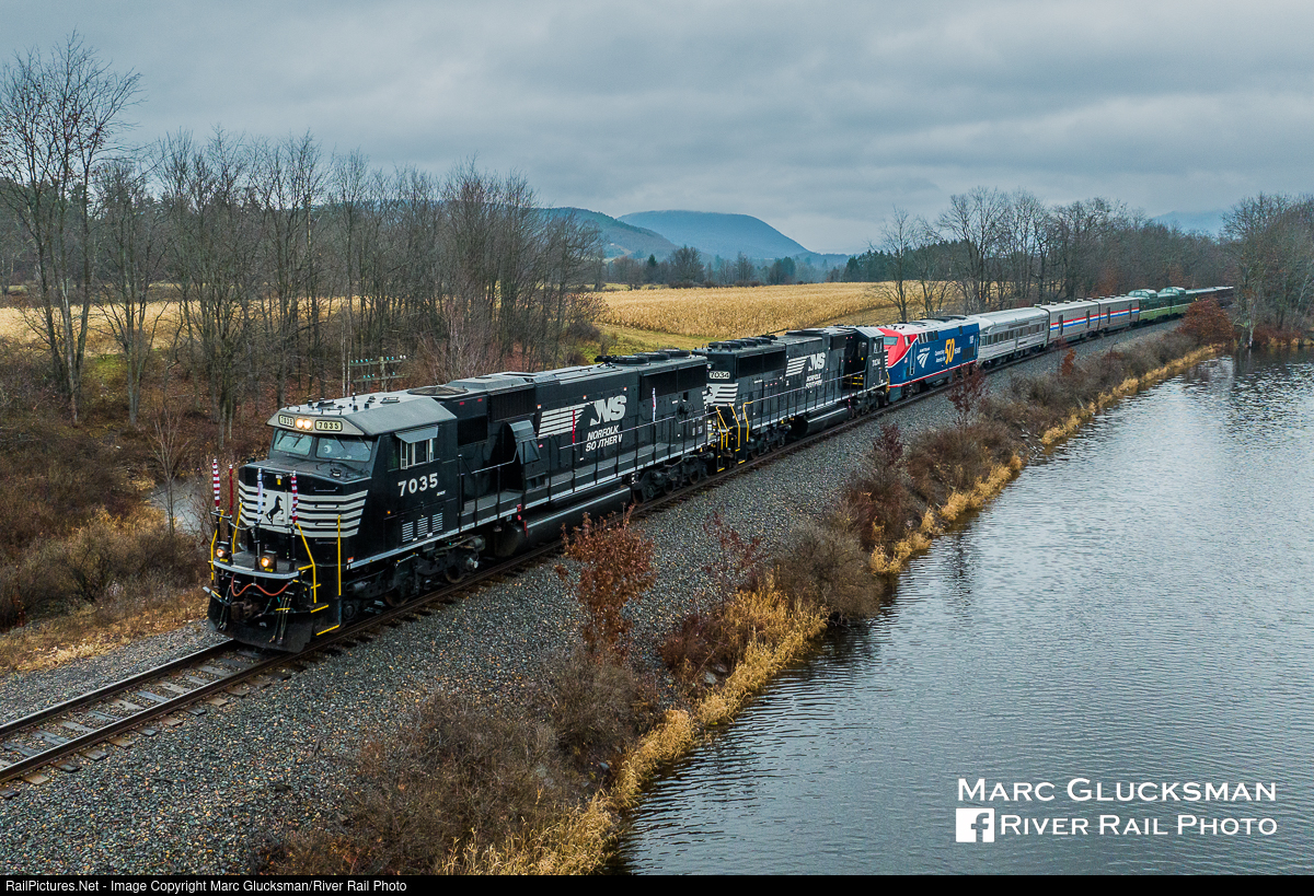 The Lake Shot. Passing by Lake Seward during the Saturday, December 2, 2023 Capital Region Toys for Tots Train, the open view shows Amtrak, Norfolk Southern, Webb Rail LLC - WEBX and Juniata Terminal Company equipment in the consist for the train to deliver toys, clothes and food to the residents of the Southern Tier. A cast of thousands helps not only on this day, but throughout the year to allow the group to bring holiday cheer across New York State.