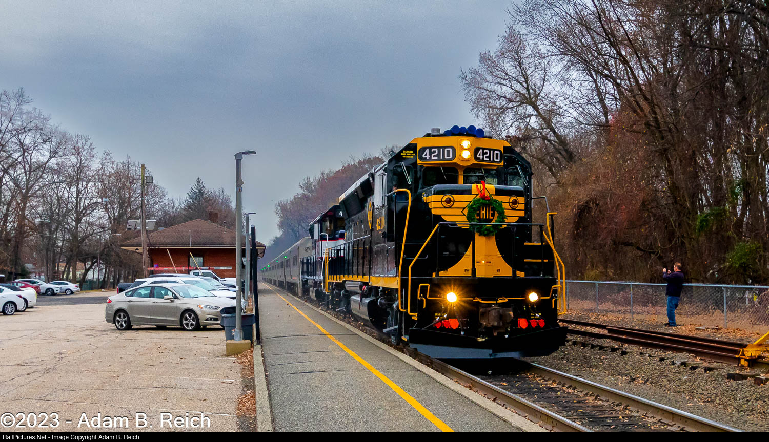 The 2023 Railmen for Children excursion, featuring NJ Transit's Erie and NJDOT heritage units, passes a railfan photographing the train along the siding at the ex-Erie Railroad station in Little Falls, NJ.