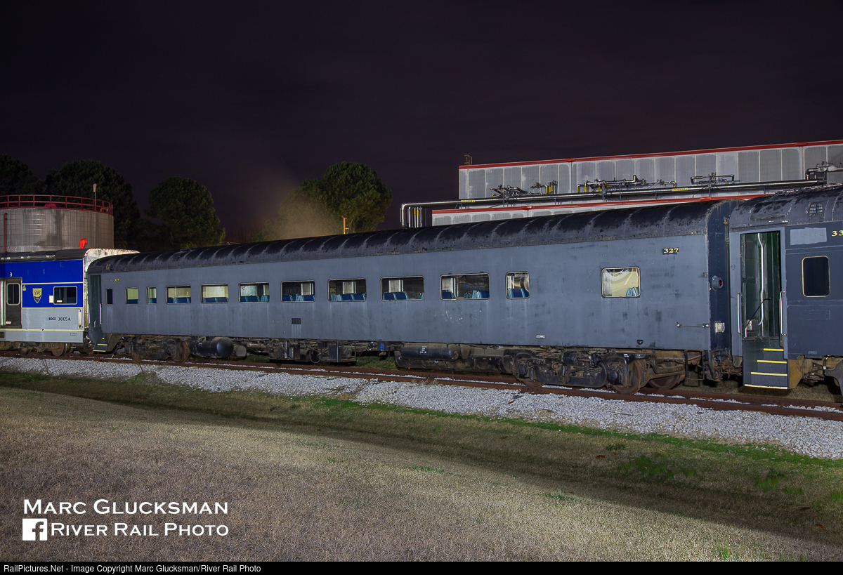 Great Northern Comes North Again. Seen sitting on the Grenada Railroad in Batesville, Mississippi during the early morning hours of December 15, 2019, United Railroad Historical Society of NJ 327 had already had several owners. Built as Great Northern 1137 (ACF, 1950), it was purchased NJ DOT for Central Railroad of New Jersey commuter service, where this class was nicknamed "Green Fleet" (for its color) or "Jersey Builder" (as a takeoff on its Empire Builder service) and renumbered 327. NJ Transit would inherit this car and eventually donate it along with seven others to the URHS, who at this time leased it to Iowa Pacific. During this week it was running on the Bateseville Christmas Train when the train derailed, and further passenger operations were suspended. The car was later sold to U.S. Sugar in Clewiston, Florida, who in turn recently resold it to the Saratoga Corinth & Hudson Railway. SCH announced that this car will be converted to a lounge car, and it is hoped to have it in service for this month's Candy Cane Express Trains.