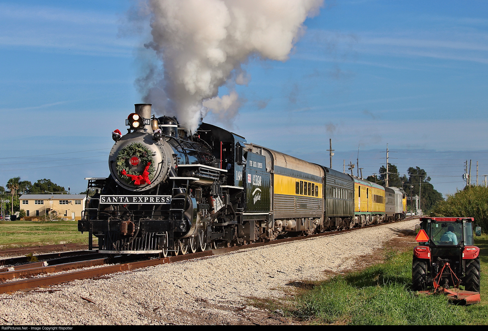 USSC 148 leads the annual Sugar Express Toys for Tots train out of their Belle Glade stop, proceeding towards their next stop of Clewiston, then the final stop of Lake Placid.