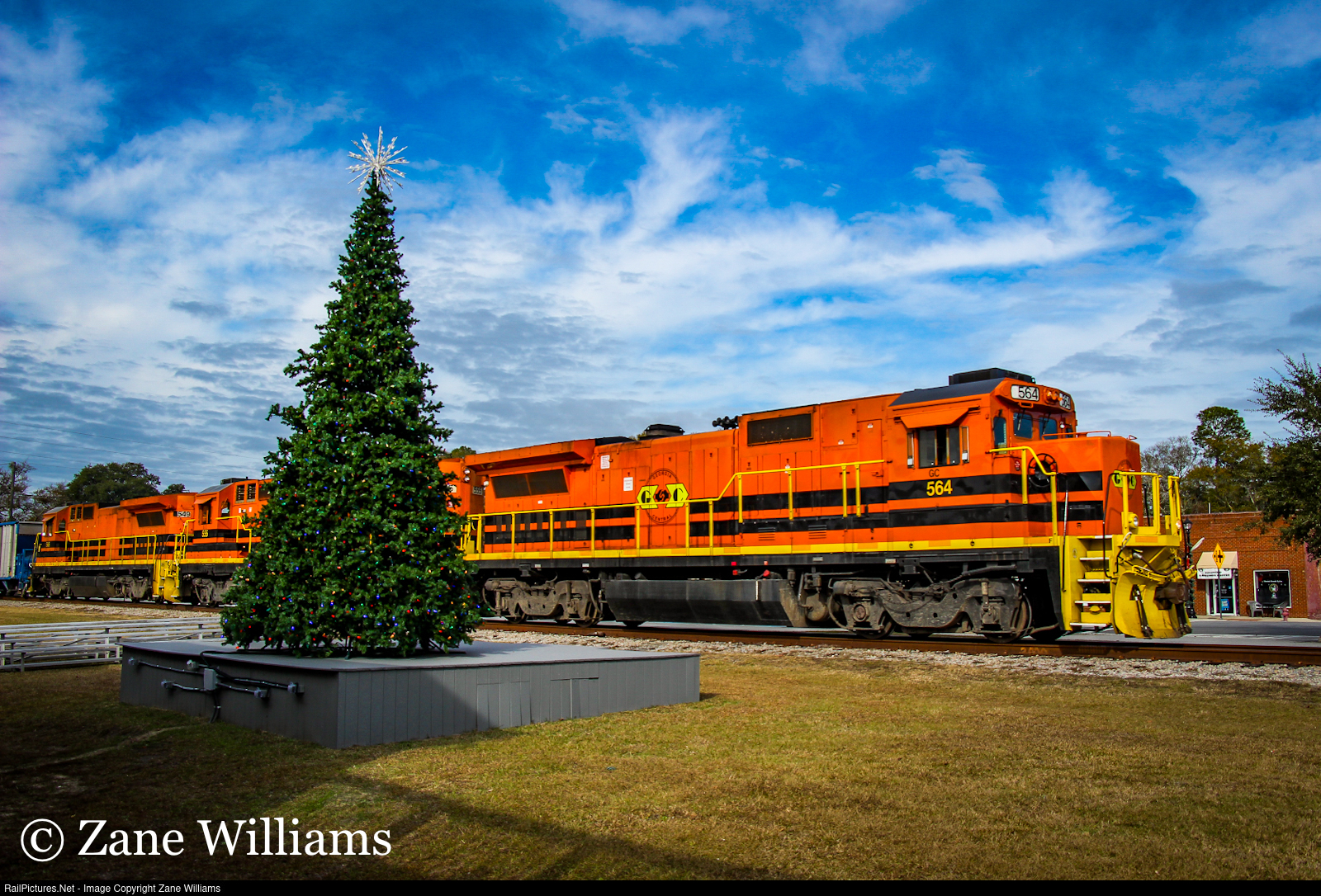 | Rolling through the town of Pembroke. Georgia Central 564 leads the eastbound morning train towards Ellabell, Georgia as it passes a Christmas Tree in the middle of town along the old Seaboard Airline mainline |