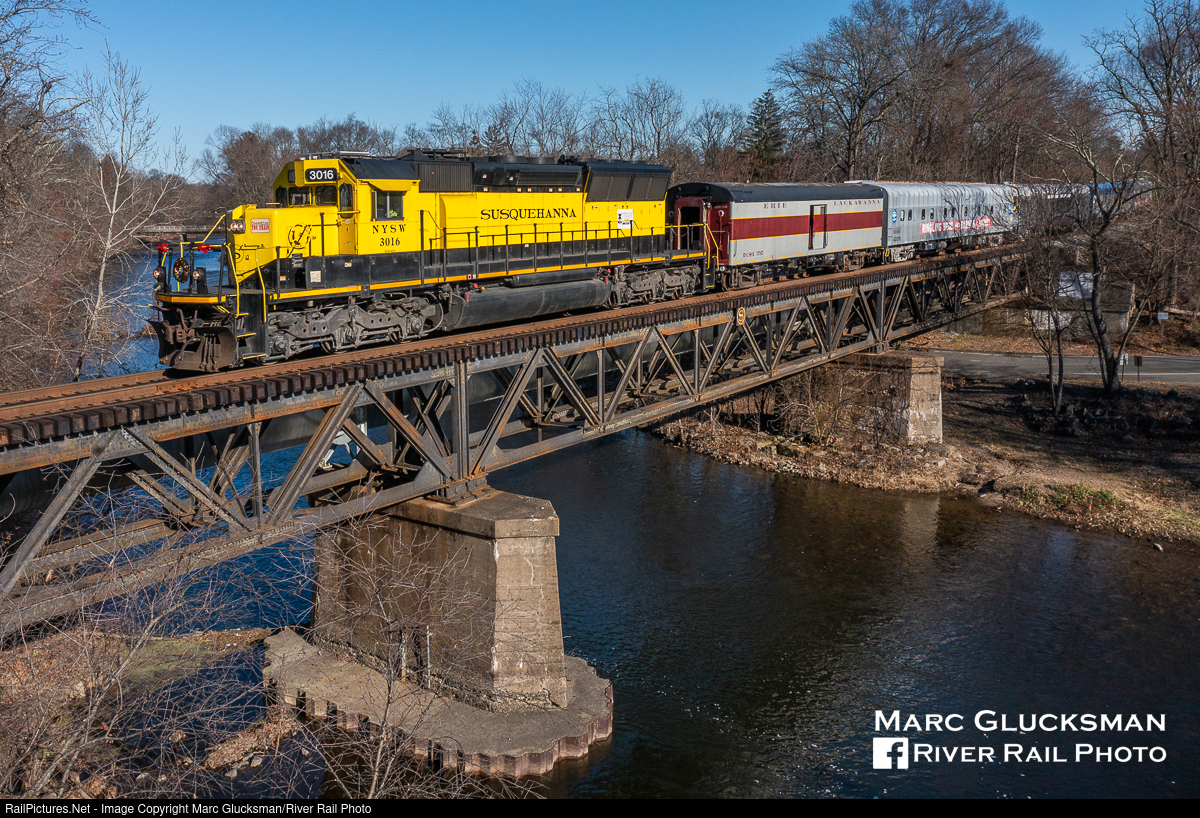 Looks Like A Toy Train But It's Real. "Every year since 2009 (except for 2020), special trains have operated on the first two weekends of December in northern New Jersey and southern New York to collect donated toys for the U.S. Marine Corps Reserve Toys for Tots Foundation" explains Operation Toy Train's website about the organization's mission to travel across New York and New Jersey during the holiday season. On Saturday, December 10, 2022, New York, Susquehanna, and Western Railway 3016 (SD33ECO, EMD) led across the Ramapo River in Oakland, New Jersey on that year's 3rd of 4 days to collect donations, an effort supported by the work of a number of volunteers and organizations. The train featured a number of pieces of equipment making their debut due to the partnerships with the Dining Car Society and the Port Jervis Transportation History Center along with the traditional power supplied by the host railroad.