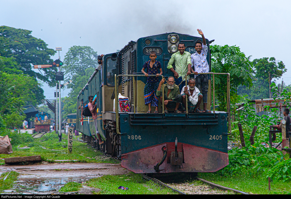 Regular scene here in Bangladesh, MLW Canada made ALCO DL535-A #2405 leaves Kishoreganj station with "38 Down- Mymensingh Express", Bhuiyanpur-Chittagong. The track which the train had left from was also occupied by EMD GT18LA-2 #2919 which was looking to couple to the stationary rake of 750 Down Egarosindhur Express, Kishoreganj-Dhaka.
