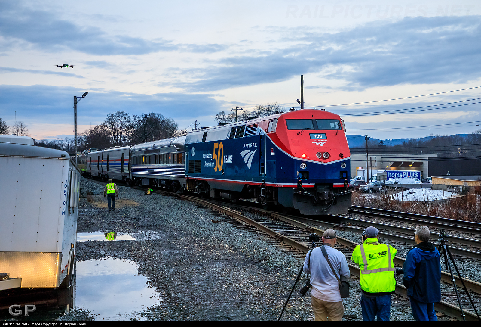 | Drones were still flying at the end of the day when NS 7035 & 7034 were cut to run around the 2023 toys For Tots Train and reveal the new tail-end for the trip Northeast, Amtrak 108 with one red marker light out. Some fellow photographers also grabbed some shots of these final moments of the day. |