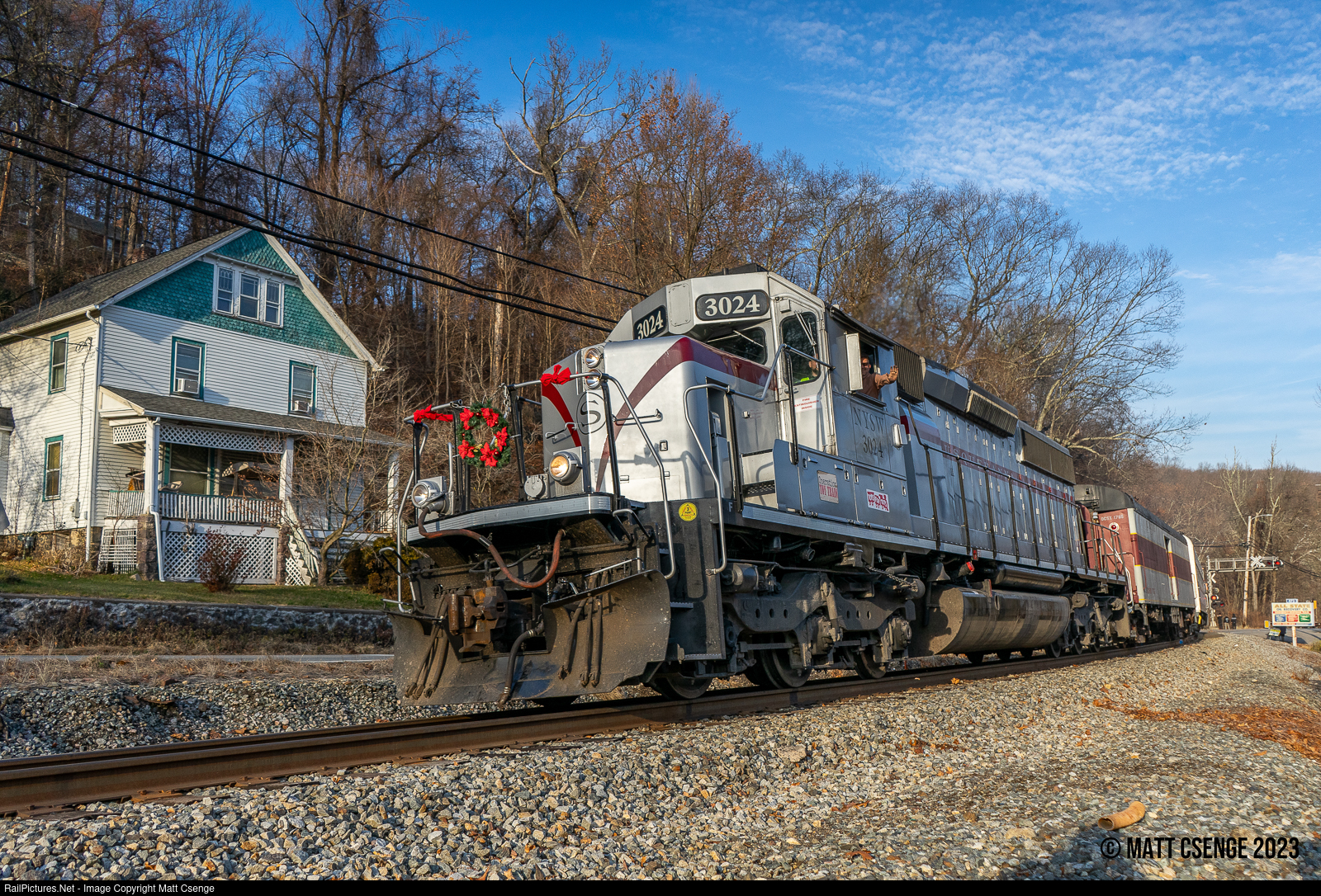 New York, Susquehanna & Western (NYSW) SD40-2 no. 3024 is the leader on the 2023 Operation Toy Train special that ran along the railroad's Southern Division Main Line on Saturday, December 9, 2023. OTT partners with railroads throughout New York and New Jersey to operate special trains collecting donated toys from various communities along their lines. The toys are later donated to the US Marine Corps Reserve Toys for Tots Foundation to be distributed to underprivileged children in the area.