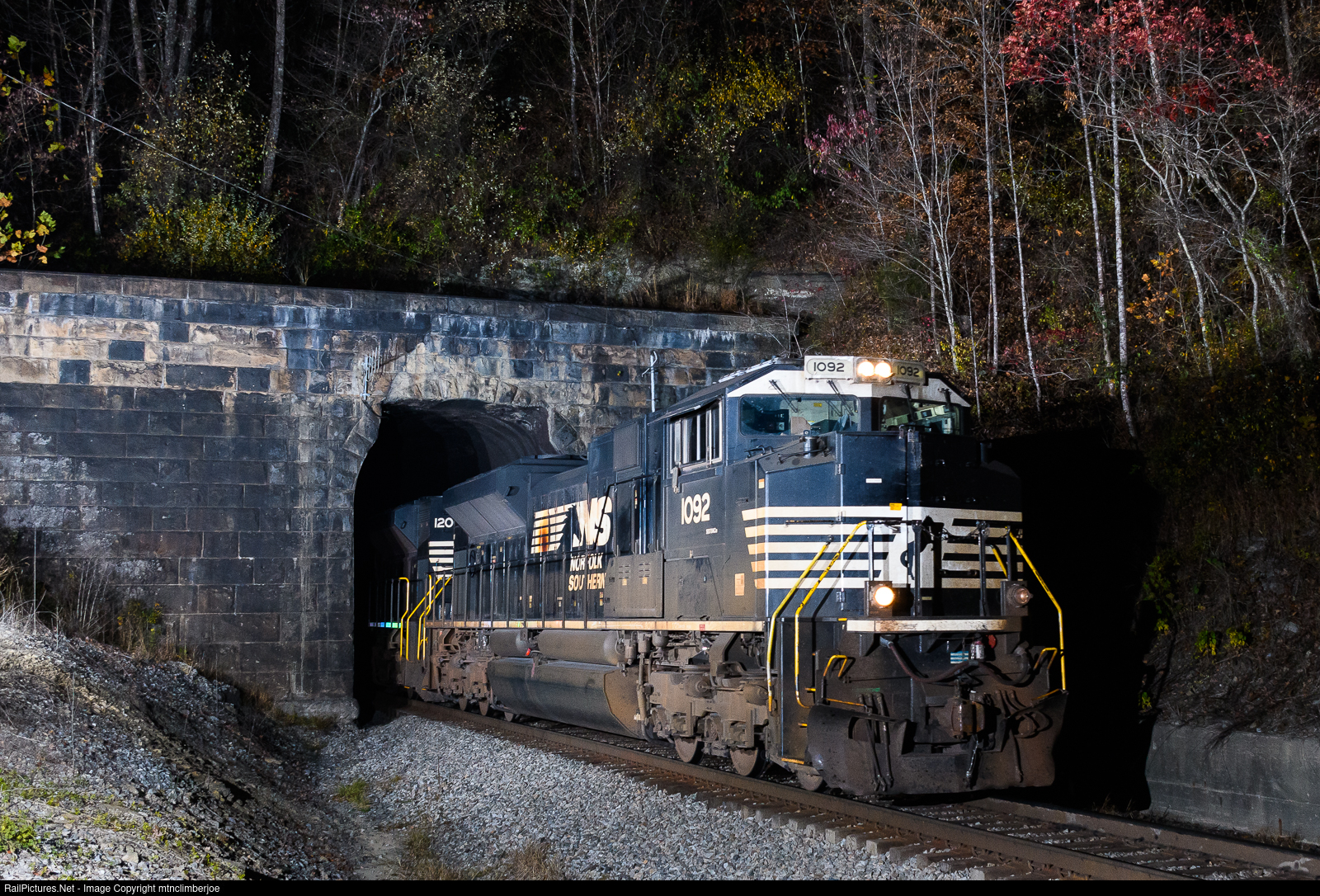 | A pair of Norfolk Southern SD70ACe's emerge out of Tunnel 4 as they lead an eastbound empty coal train through Crum, West Virginia on the Kenova District. The top of the stone block tunnel portal shows evidence of the clearance project done to accommodate double stack intermodal trains. |