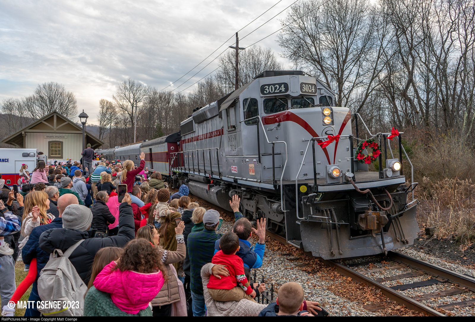 The Operation Toy Train special arrived to a large crowd at Sparta Station on December 9, 2023 with New York, Susquehanna & Western (NYSW) SD40-2 no. 3024 in the lead. Over the course of the day-long run on the NYSW Southern Division, the train collected over 20,000 toys to donate to the US Marine Corps Reserve Toys for Tots Foundation!